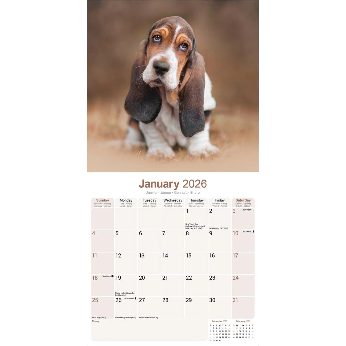Un calendrier de 16 mois utilisable à partir de septembre 2025 contenant 13 belles images de votre race de chien préférée, le BASSET HOUND. Le calendrier contient tous les jours fériés, les événements notables et les dates importantes. Le calendrier comporte également de grandes grilles pour prendre des notes sur ces dates spéciales à retenir.