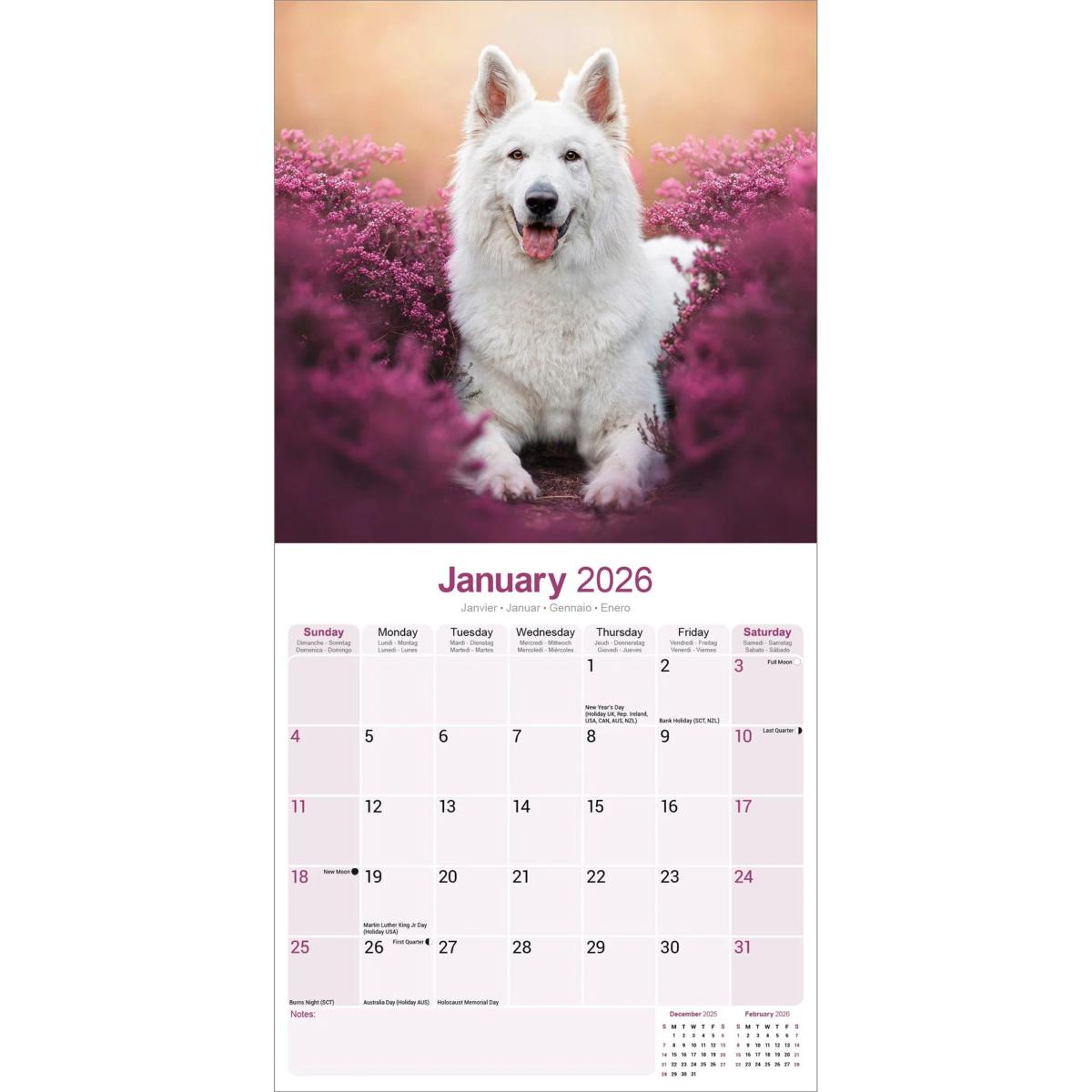Un calendrier de 16 mois utilisable à partir de septembre 2025 contenant 13 belles images de votre race de chien préférée, le BERGER BLANC SUISSE. Le calendrier contient tous les jours fériés, les événements notables et les dates importantes. Le calendrier comporte également de grandes grilles pour prendre des notes sur ces dates spéciales à retenir.