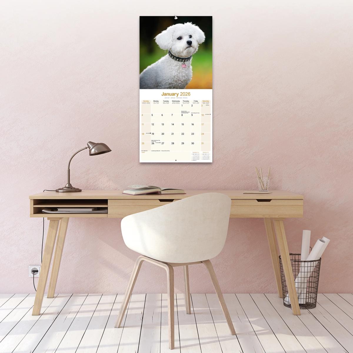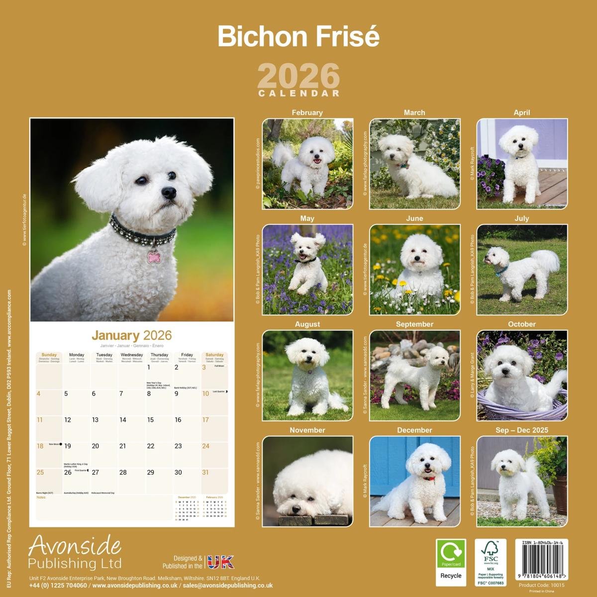 Un calendrier de 16 mois utilisable à partir de septembre 2025 contenant 13 belles images de votre race de chien préférée, le BICHON FRISE. Le calendrier contient tous les jours fériés, les événements notables et les dates importantes. Le calendrier comporte également de grandes grilles pour prendre des notes sur ces dates spéciales à retenir.