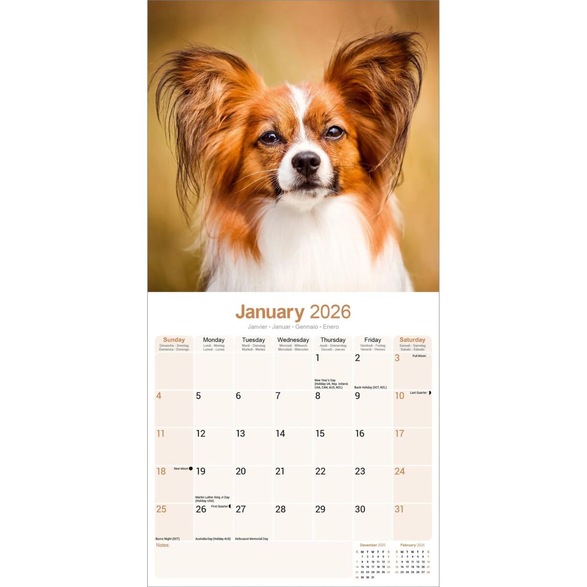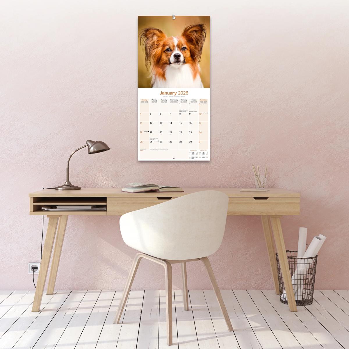 Un calendrier de 16 mois utilisable à partir de septembre 2025 contenant 13 belles images de votre race de chien préférée, le EPAGNEUL PAPILLON NAIN. Le calendrier contient tous les jours fériés, les événements notables et les dates importantes. Le calendrier comporte également de grandes grilles pour prendre des notes sur ces dates spéciales à retenir.