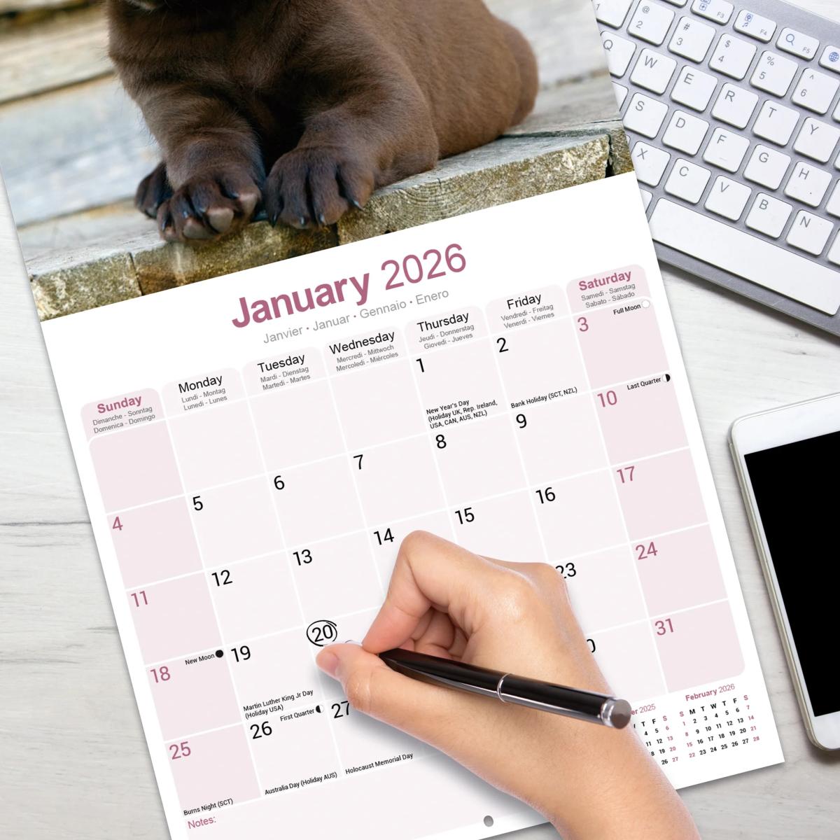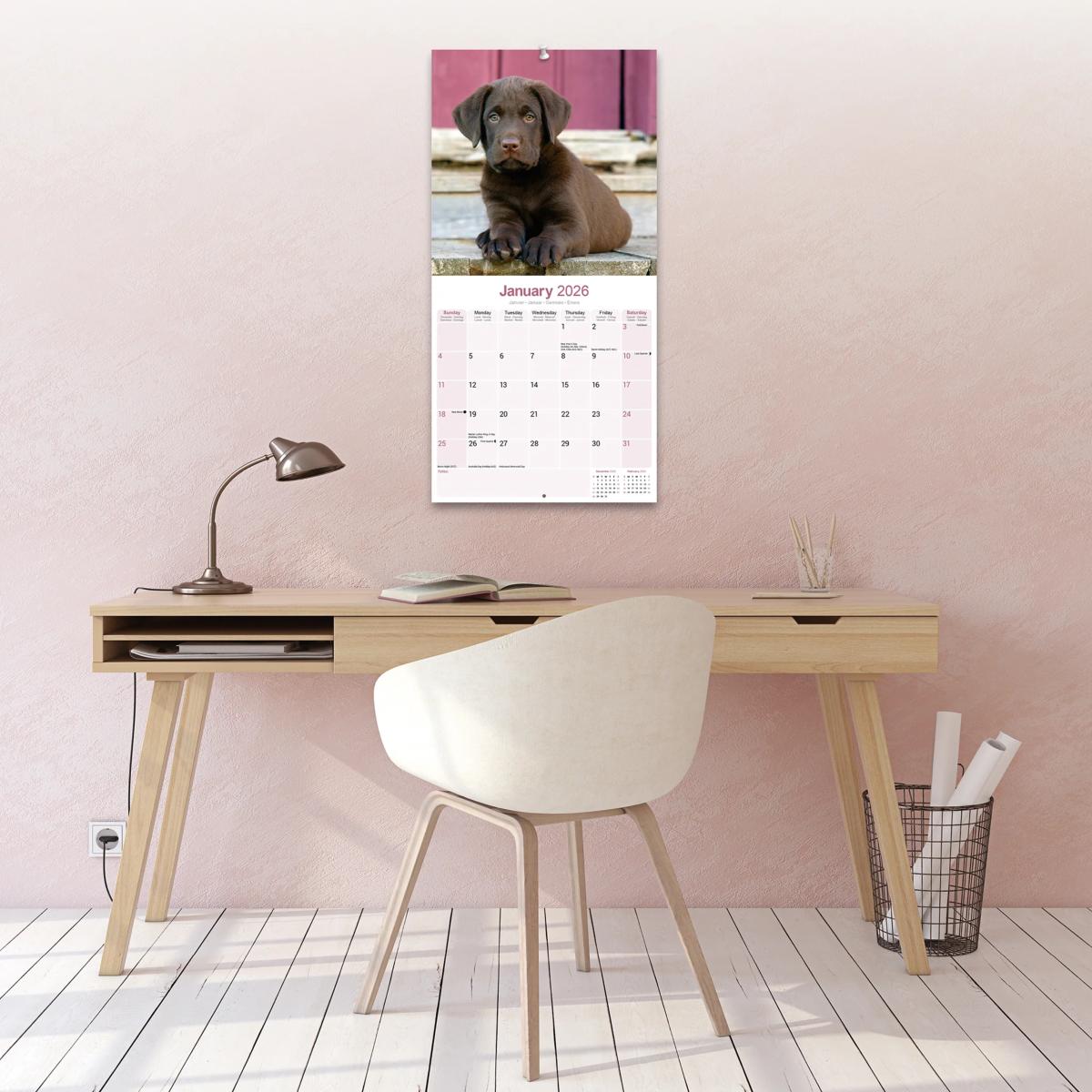 Un calendrier de 16 mois utilisable à partir de septembre 2025 contenant 13 belles images de votre race de chien préférée, le LABRADOR CHOCOLAT. Le calendrier contient tous les jours fériés, les événements notables et les dates importantes. Le calendrier comporte également de grandes grilles pour prendre des notes sur ces dates spéciales à retenir.