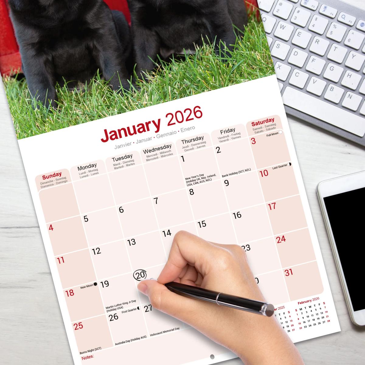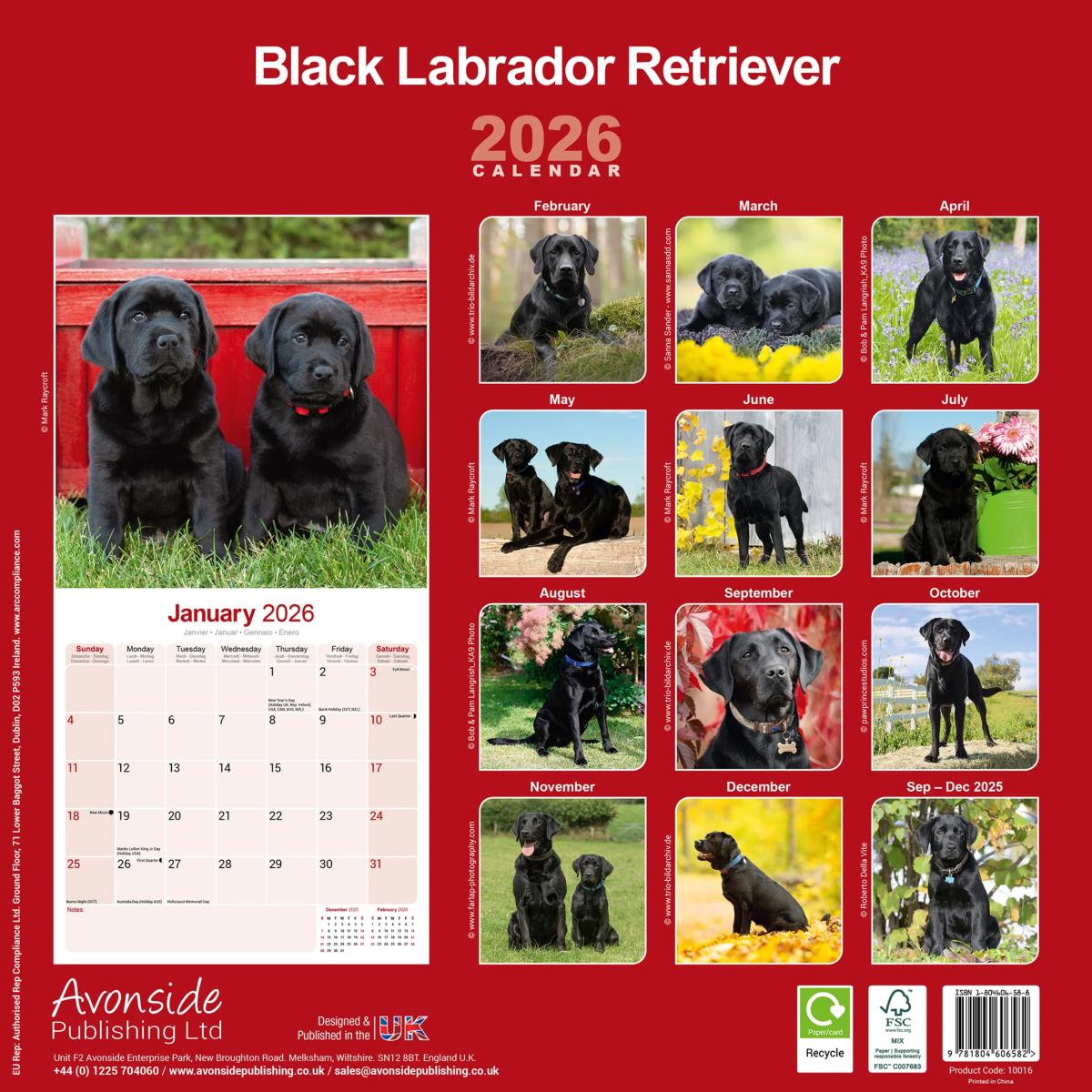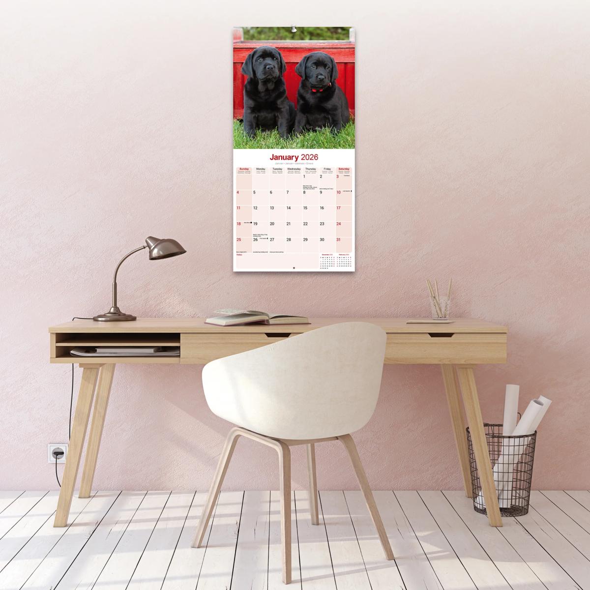 Un calendrier de 16 mois utilisable à partir de septembre 2025 contenant 13 belles images de votre race de chien préférée, le LABRADOR NOIR. Le calendrier contient tous les jours fériés, les événements notables et les dates importantes. Le calendrier comporte également de grandes grilles pour prendre des notes sur ces dates spéciales à retenir.