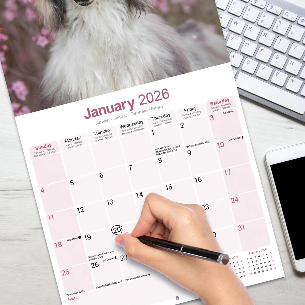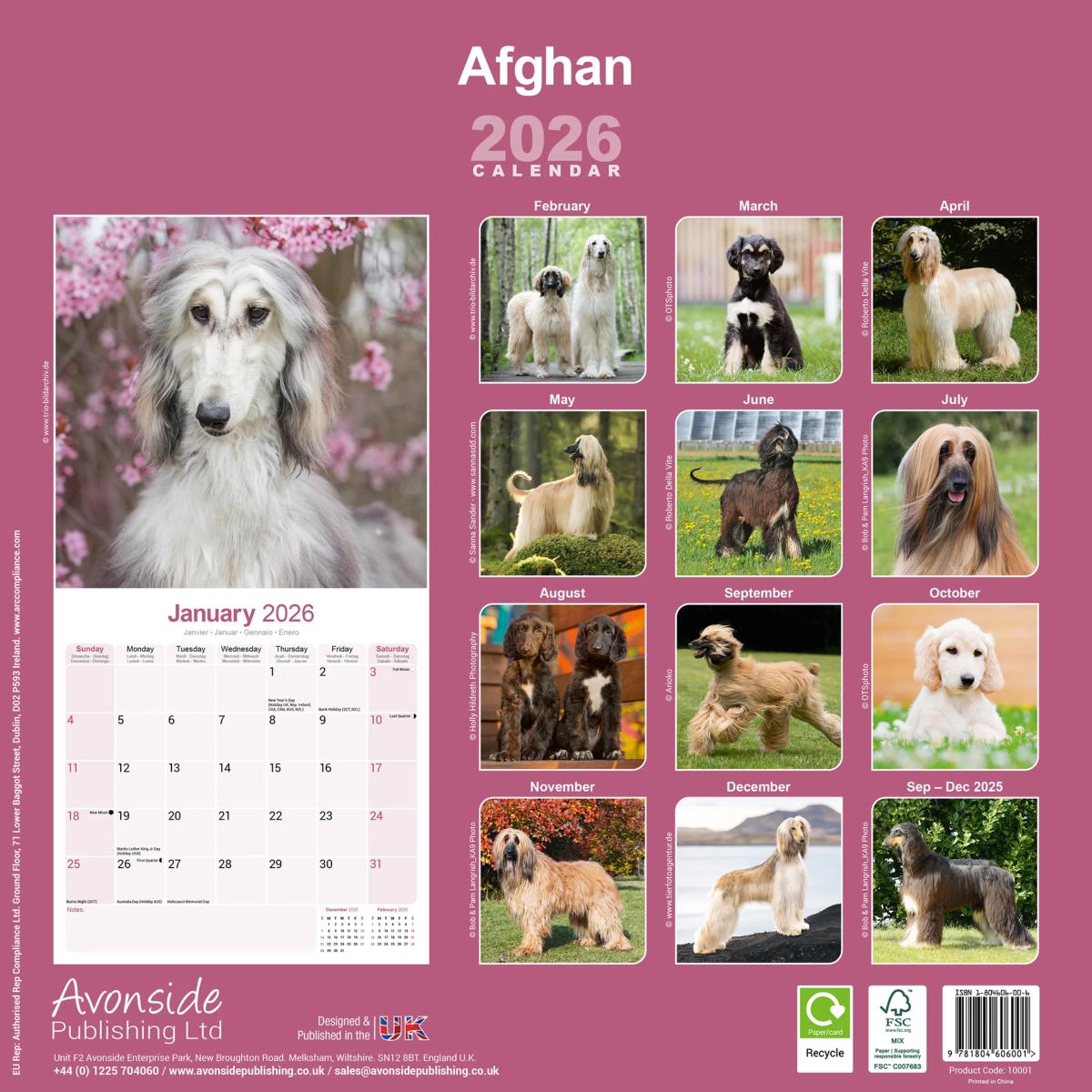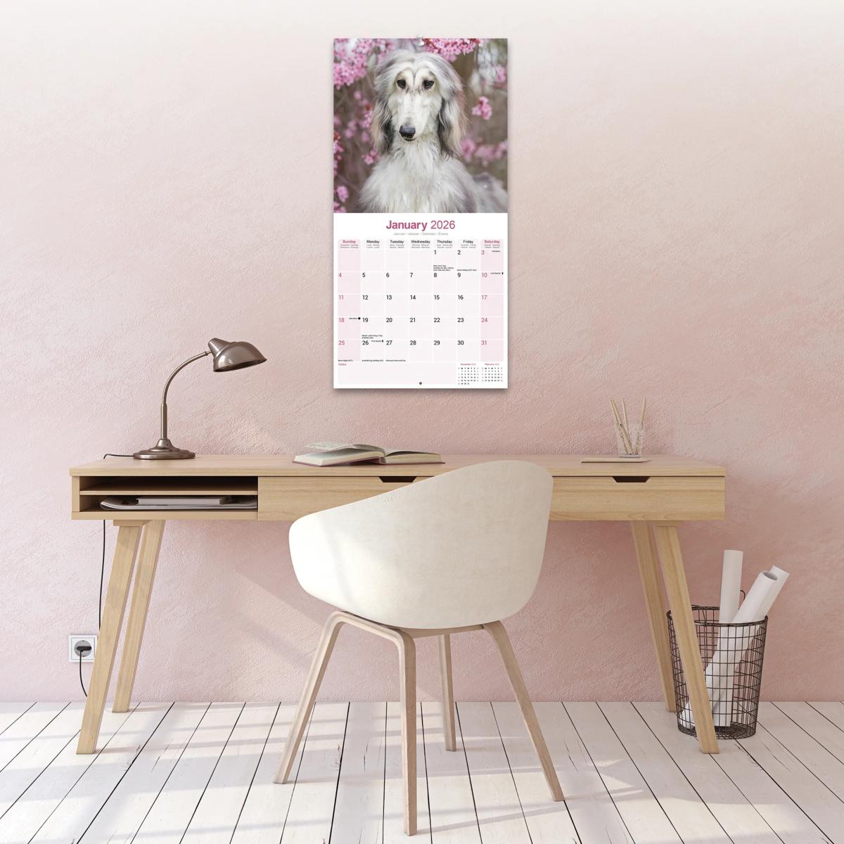 Un calendrier de 16 mois utilisable à partir de septembre 2025 contenant 13 belles images de votre race de chien préférée, le LEVRIER AFGHAN. Le calendrier contient tous les jours fériés, les événements notables et les dates importantes. Le calendrier comporte également de grandes grilles pour prendre des notes sur ces dates spéciales à retenir.
