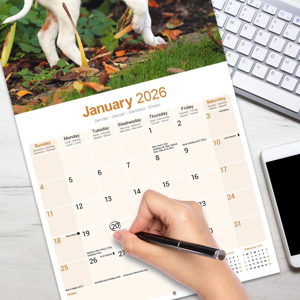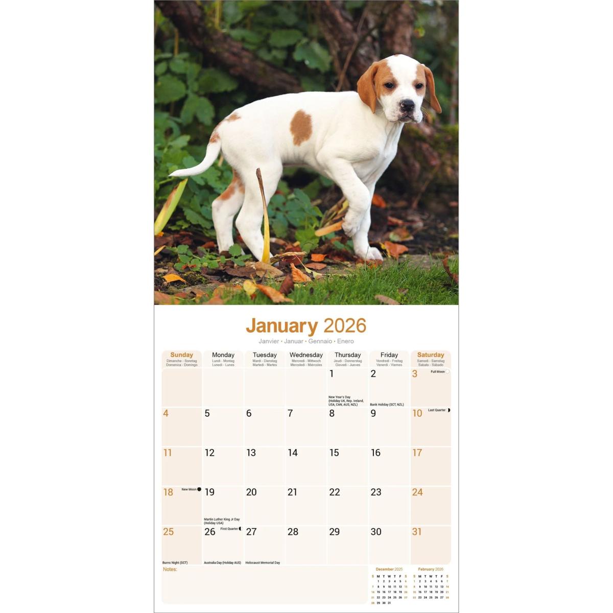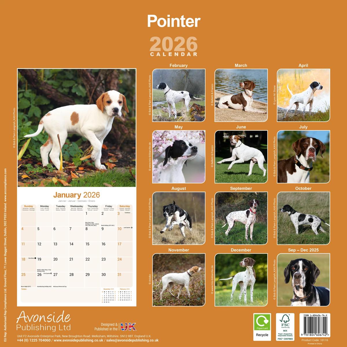 Un calendrier de 16 mois utilisable à partir de septembre 2025 contenant 13 belles images de votre race de chien préférée, le POINTER. Le calendrier contient tous les jours fériés, les événements notables et les dates importantes. Le calendrier comporte également de grandes grilles pour prendre des notes sur ces dates spéciales à retenir.