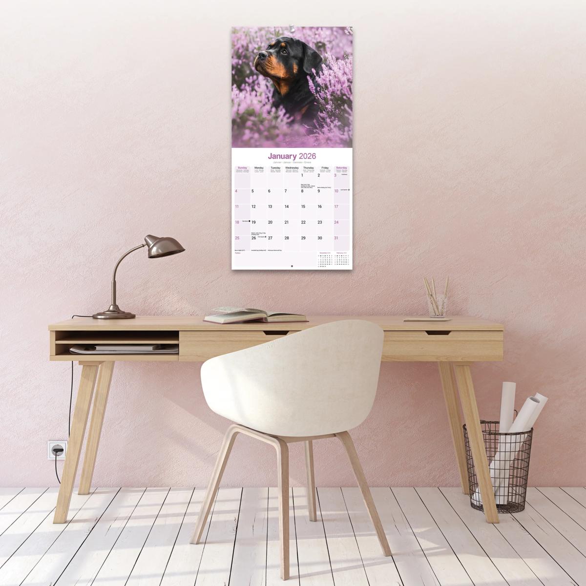 Un calendrier de 16 mois utilisable à partir de septembre 2025 contenant 13 belles images de votre race de chien préférée, le ROTTWEILER. Le calendrier contient tous les jours fériés, les événements notables et les dates importantes. Le calendrier comporte également de grandes grilles pour prendre des notes sur ces dates spéciales à retenir.