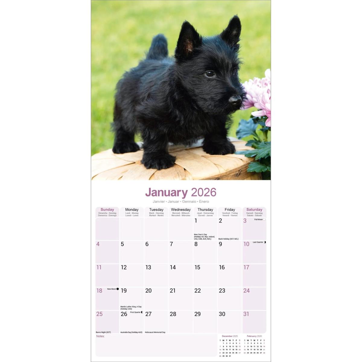 Un calendrier de 16 mois utilisable à partir de septembre 2025 contenant 13 belles images de votre race de chien préférée, le SCOTTISH TERRIER. Le calendrier contient tous les jours fériés, les événements notables et les dates importantes. Le calendrier comporte également de grandes grilles pour prendre des notes sur ces dates spéciales à retenir.