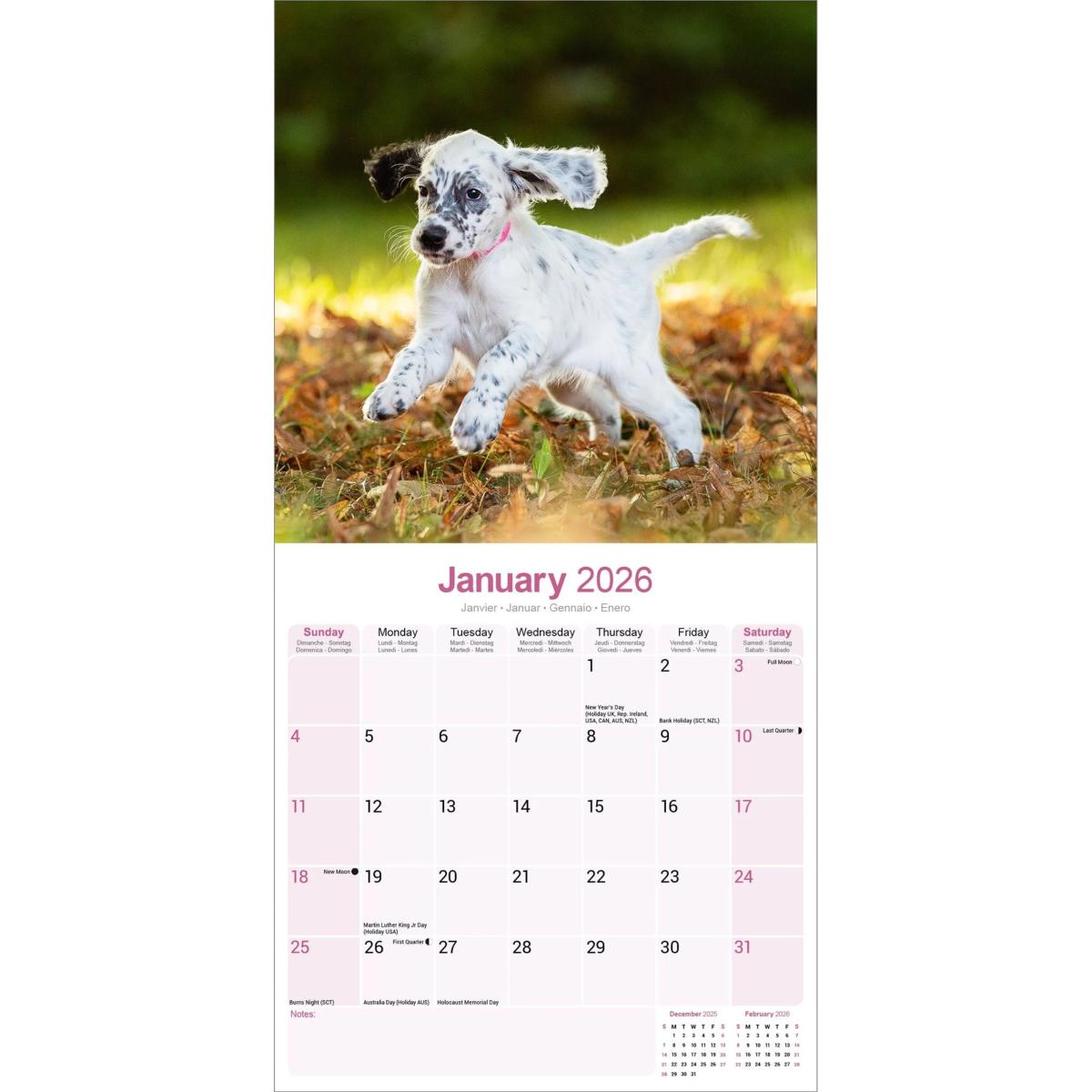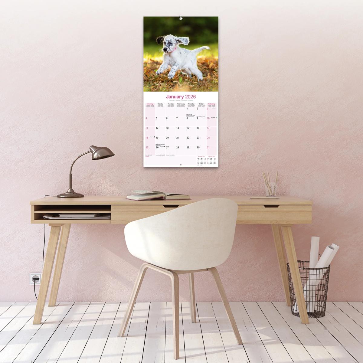 Un calendrier de 16 mois utilisable à partir de septembre 2025 contenant 13 belles images de votre race de chien préférée, le SETTER ANGLAIS. Le calendrier contient tous les jours fériés, les événements notables et les dates importantes. Le calendrier comporte également de grandes grilles pour prendre des notes sur ces dates spéciales à retenir.
