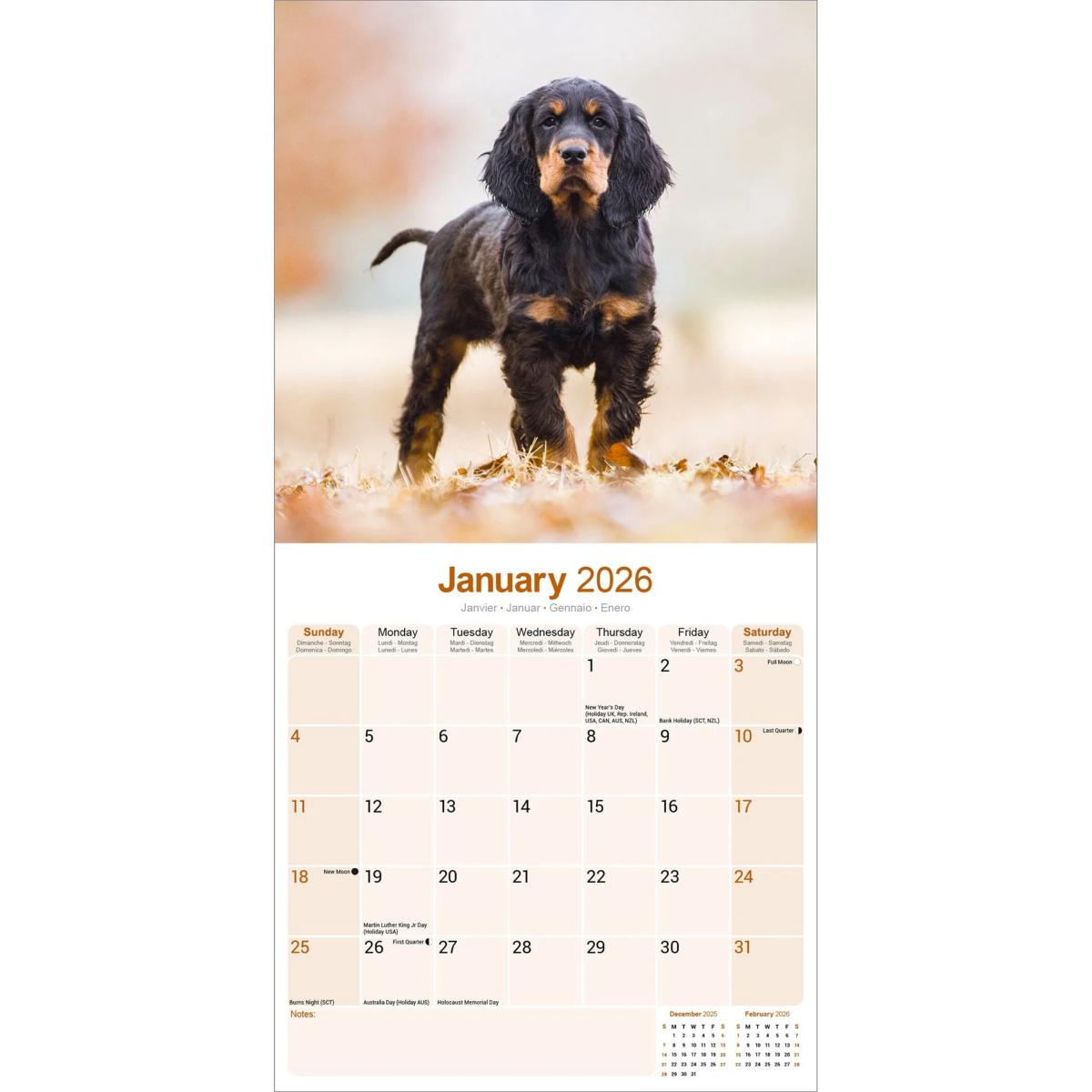 Un calendrier de 16 mois utilisable à partir de septembre 2025 contenant 13 belles images de votre race de chien préférée, le SETTER GORDON. Le calendrier contient tous les jours fériés, les événements notables et les dates importantes. Le calendrier comporte également de grandes grilles pour prendre des notes sur ces dates spéciales à retenir.