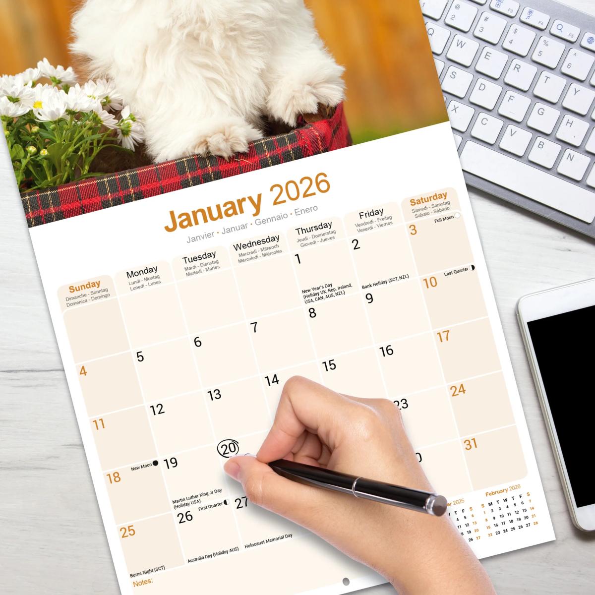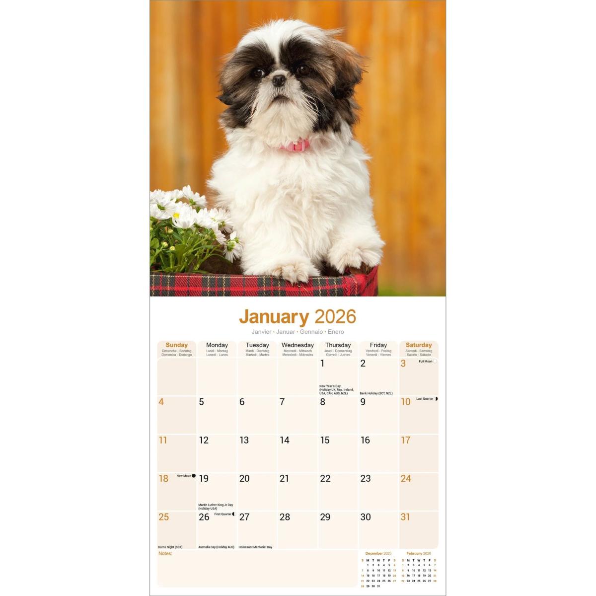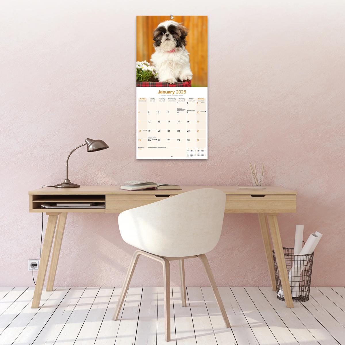 Un calendrier de 16 mois utilisable à partir de septembre 2025 contenant 13 belles images de votre race de chien préférée, le SHIH TZU. Le calendrier contient tous les jours fériés, les événements notables et les dates importantes. Le calendrier comporte également de grandes grilles pour prendre des notes sur ces dates spéciales à retenir.