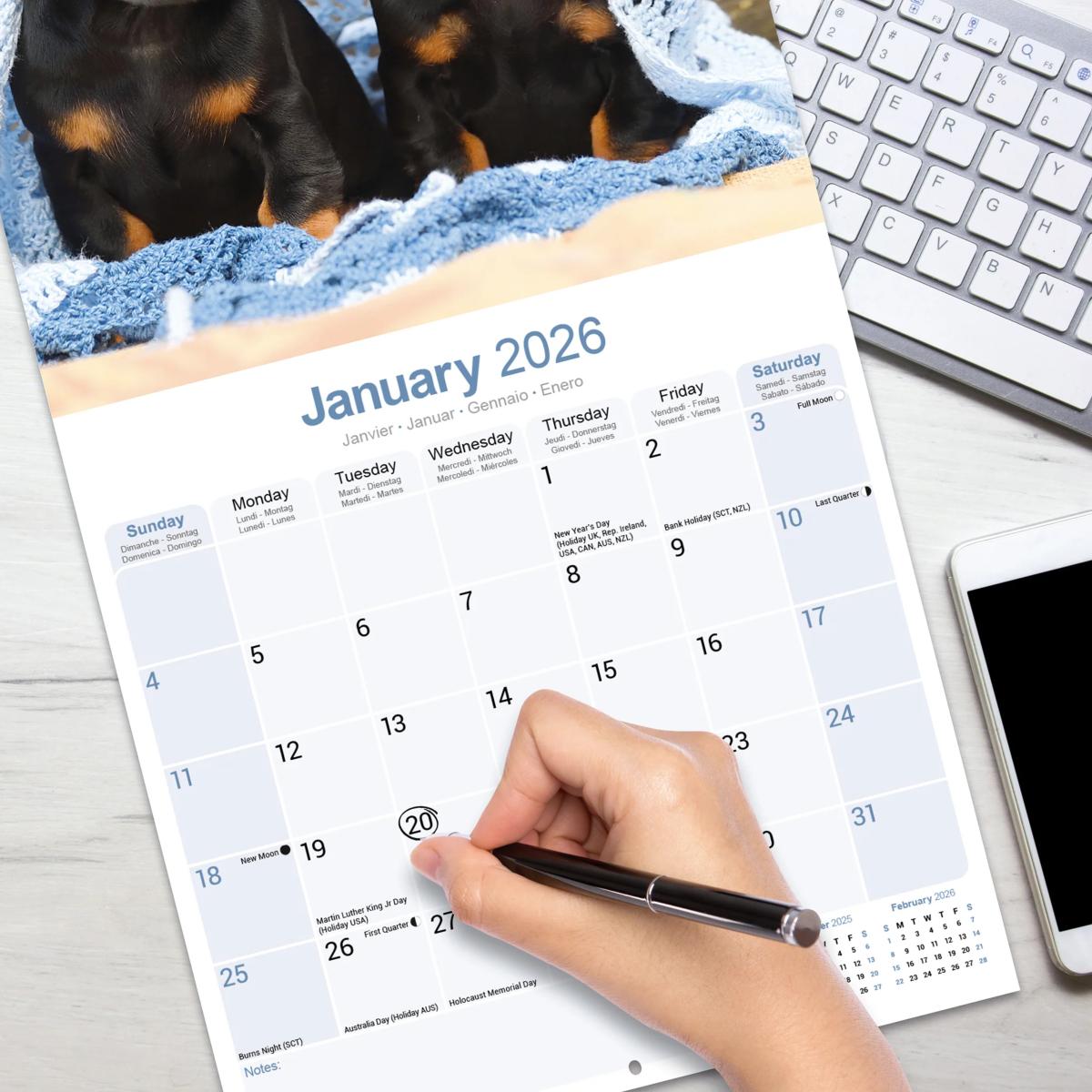 Un calendrier de 16 mois utilisable à partir de septembre 2025 contenant 13 belles images de votre race de chien préférée, le TECKEL POIL COURT. Le calendrier contient tous les jours fériés, les événements notables et les dates importantes. Le calendrier comporte également de grandes grilles pour prendre des notes sur ces dates spéciales à retenir.